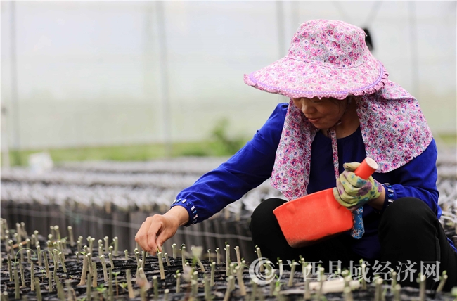 4月12日,一名妇女在广西柳州市融安县大良镇古兰村大棚中嫁接金桔苗。(谭凯兴摄)