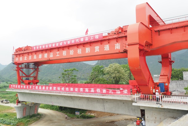 经过三个多小时的奋战,4月29日上午11时许,一榀长32米、重900吨钢筋混凝土标准跨度简支梁,成功架落在贵南高铁都安瑶族自治县澄江双线特大桥指定桥墩上,这是贵阳至南宁高速铁路架设的第一榀箱梁,不仅吹响了贵南高铁架梁施工的号角,也标志着贵南高铁广西段线上施工正式启动。