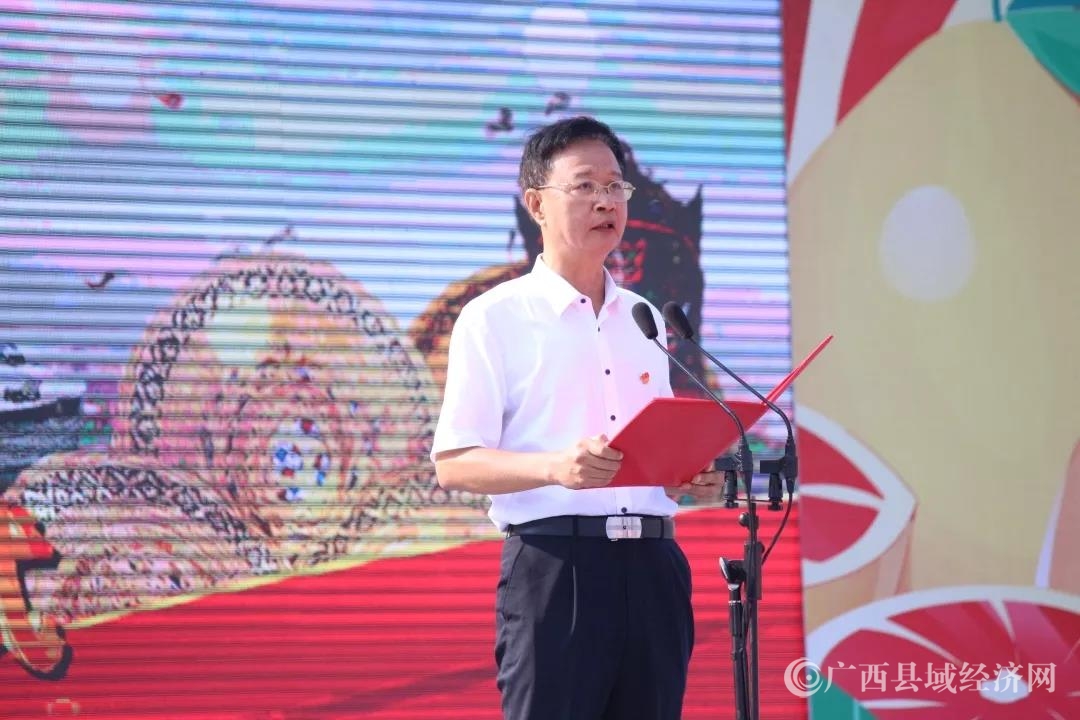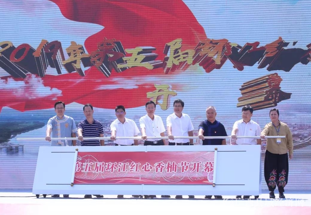 开幕仪式上,自治区扶贫办党组成员、副主任朱有奎,自治区党委组织部组织六处处长梁燕海,广西广播电视台台务会议成员蔡健,自治区市场监督管理局个体私营经济监管处调研员赖建春,河池市人民政府副市长罗军,政协河池市委员会副主席陈健,环江毛南族自治县党委书记黄荣彪,环江毛南族自治县党委副书记、县长黄炳峰共同推杆开启第五届环江红心香柚节。