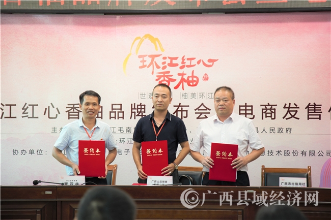 当日下午,在环江县行政会议中心还举行了环江红心香柚品牌发布会暨电商发售仪式。会上,红心香柚基地负责人与经销商代表正式签约,今后双方将携手并进,开展深入合作,共同推进环江红心香柚产业发展。