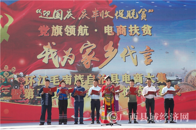 活动当天围绕党旗领航·电商扶贫“我为家乡代言”主题,环江红心香柚、“五香”食品等种植户或养殖户,以及毛南文化传承人作为代言人,现场讲述扶贫故事,推介特色物产,又一次面向全国打开了一扇展示地方特色产业和毛南山乡民族文化的窗口。