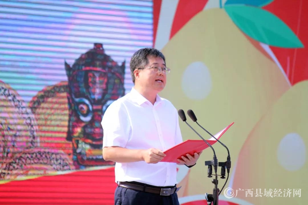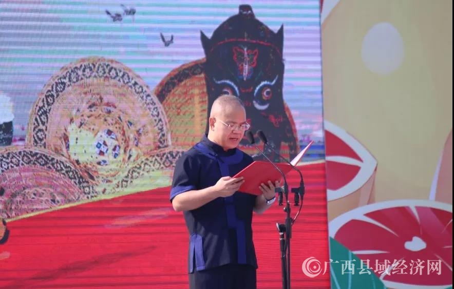 ▲环江红心香柚品牌发布会暨电商发售仪式上,环江毛南族自治县党委常委、副县长施东辉发言