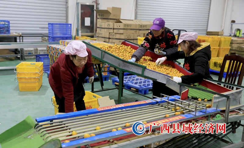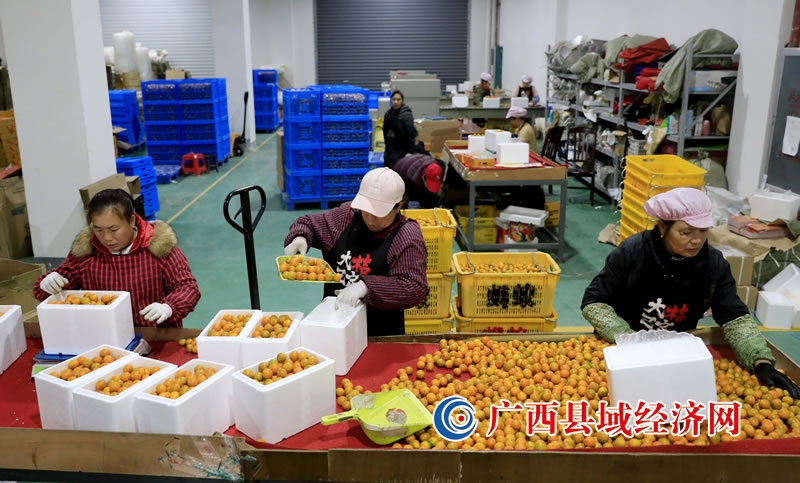 1月27日,在广西柳州市电子商务服务中心融安金桔“云仓”车间,工人们正忙着包装金桔,准备外运销售。(覃庆和 摄)