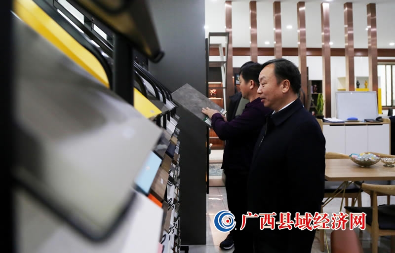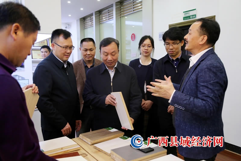 3月25日,在广西柳州市融安县壮象木业有限公司香杉家居生活体验馆,百色市林业系统考察团参观了解香杉生态板材展览品。(陈国正 摄)