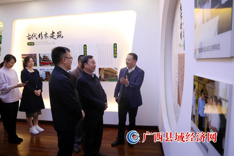 3月25日,在广西柳州市融安县壮象木业有限公司国木香杉馆,百色市林业系统考察团参观了解香杉文化历史。(陈国正 摄)