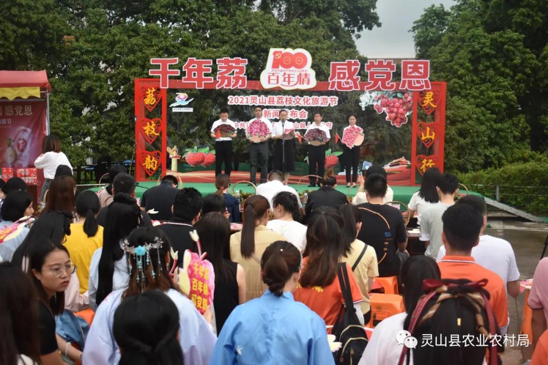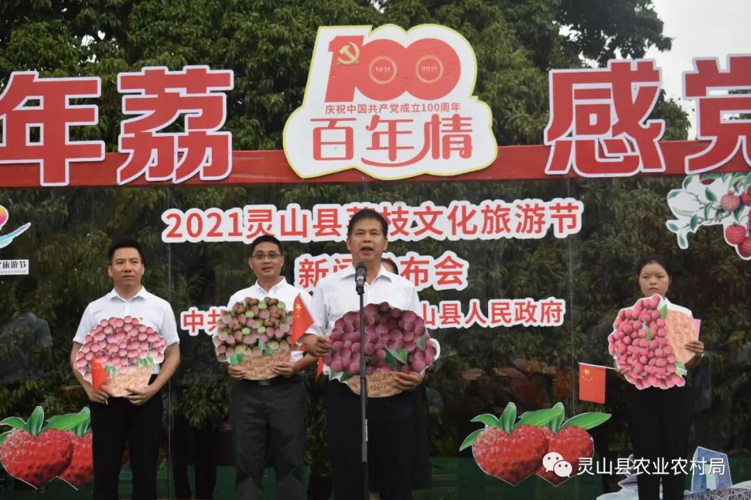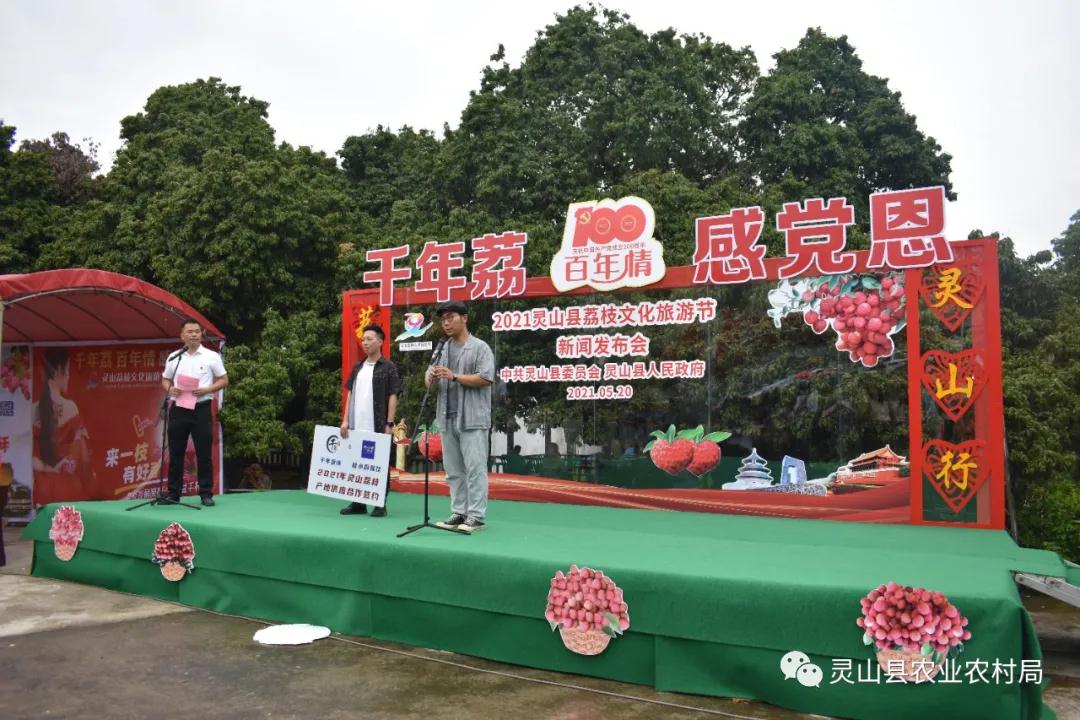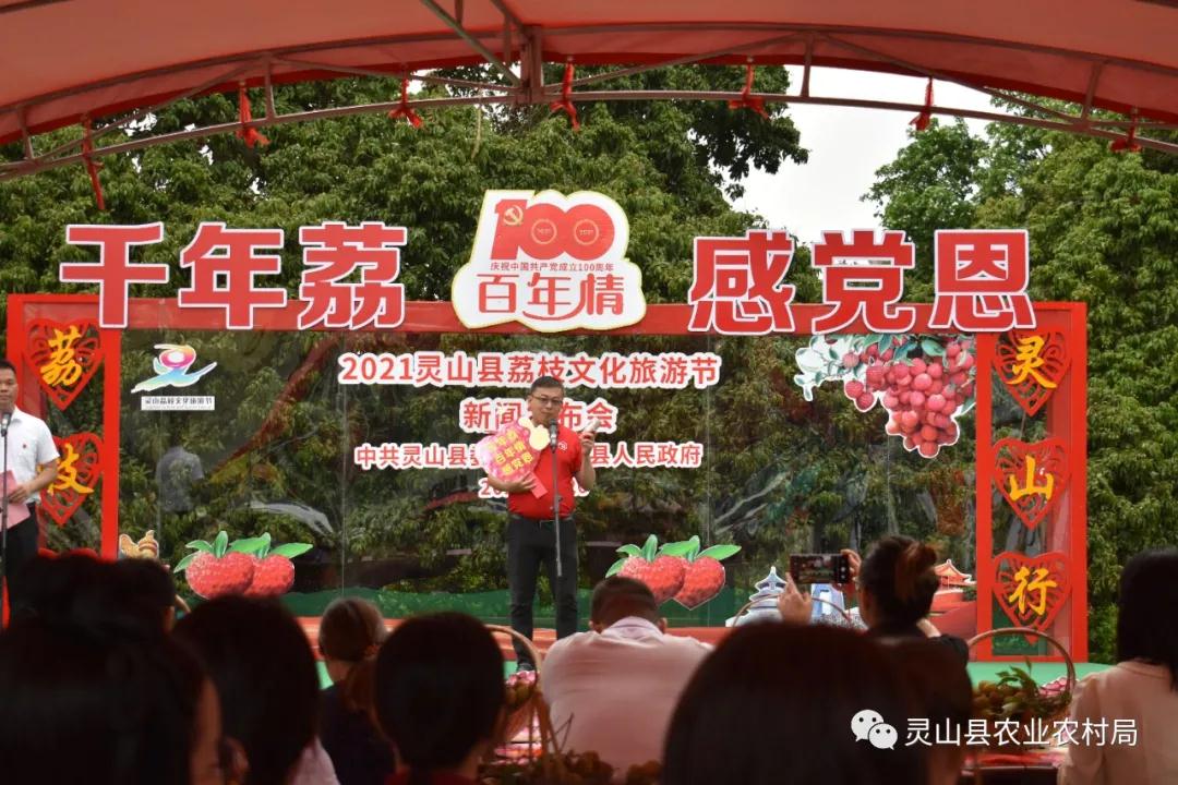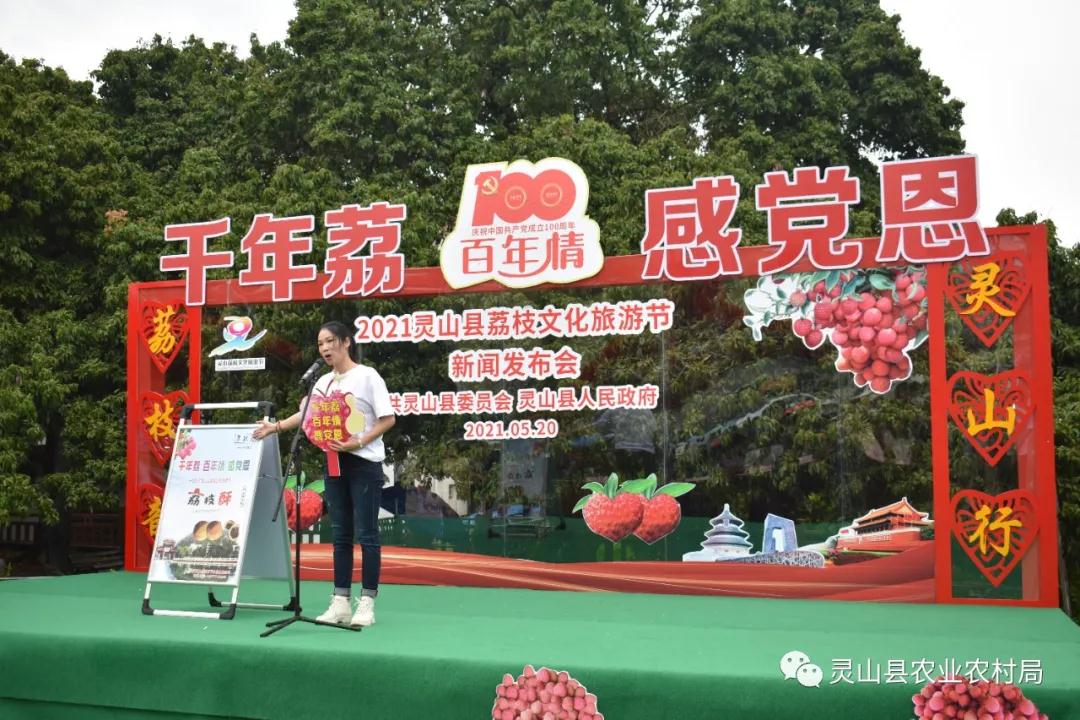 5月20日,灵山县在新圩千年古荔园举办“千年荔 百年情 感党恩——2021灵山县荔枝文化旅游节”新闻发布会。灵山县委常委、宣传部部长,副县长黄春柳出席发布会并致发布词。