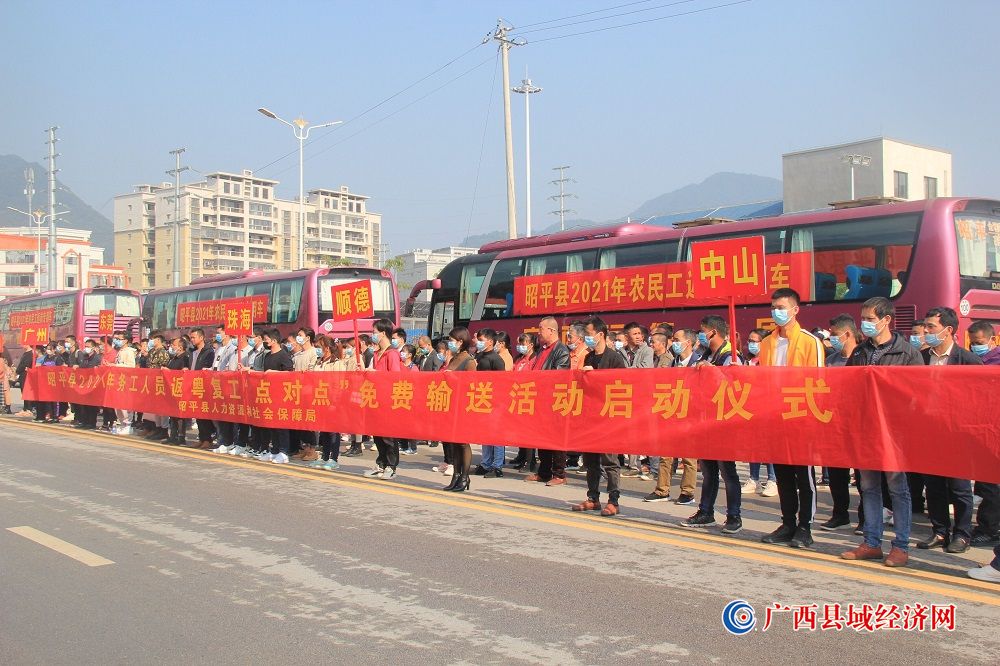 图为广西昭平县开展“点对点”返岗复工服务保障活动,免费输送农民工至务工地