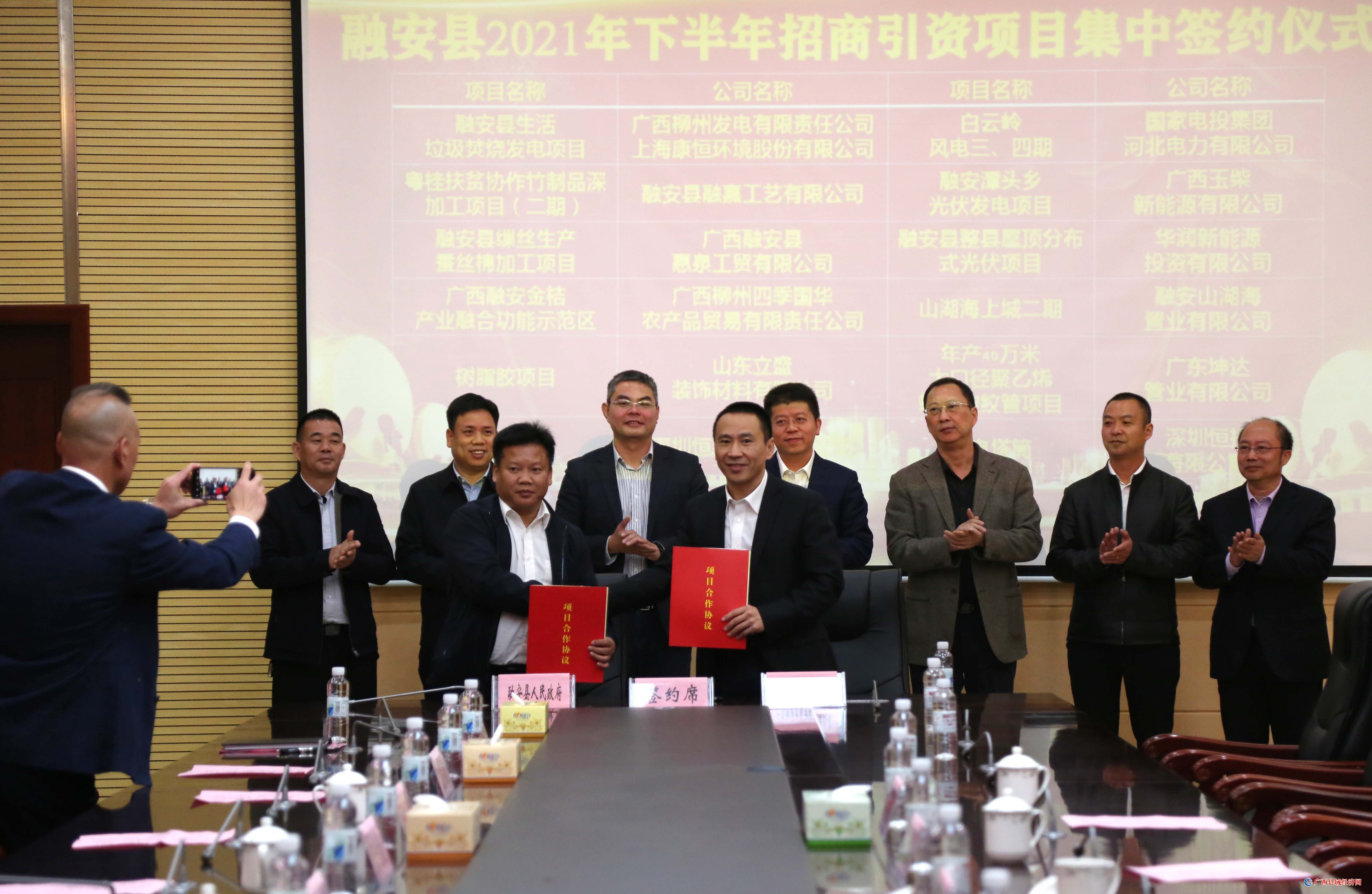 12月3日,融安县在县会议中心举办2021年下半年招商引资项目集中签约仪式,集中签约融安县生活垃圾焚烧发电、粤桂扶贫协作竹制品深加工(二期)、白云岭风电三期四期等多个重大项目,推动县域工业化进程,促进融安经济社会快速发展。