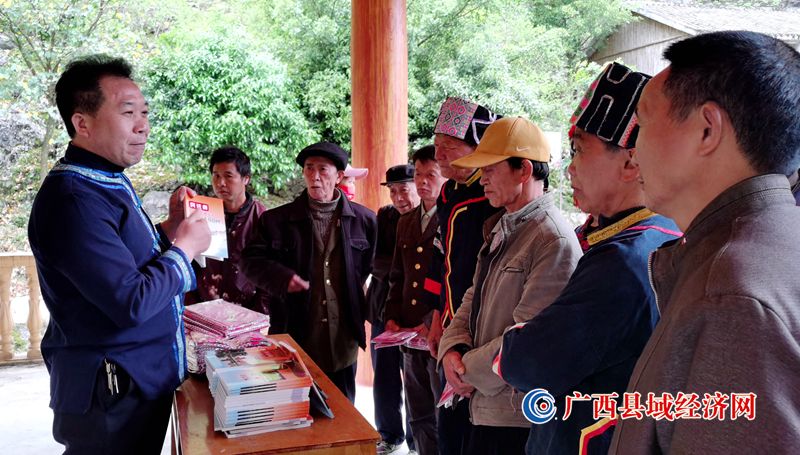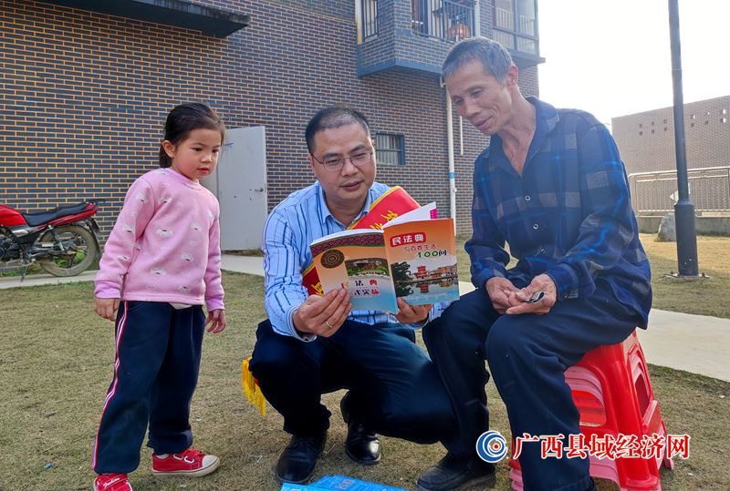 3月22日,东兰县司法局工作人员走进三弄瑶族乡三合村弄宁瑶寨,开展以宣传《民法典》为中心的普法活动,把法治宣传送进瑶寨。58岁瑶族村民蒙胜文现场即兴唱起山歌:“普法宣传到瑶寨,布努群众忙学法,今日学习民法典,瑶寨幸福又和谐。”