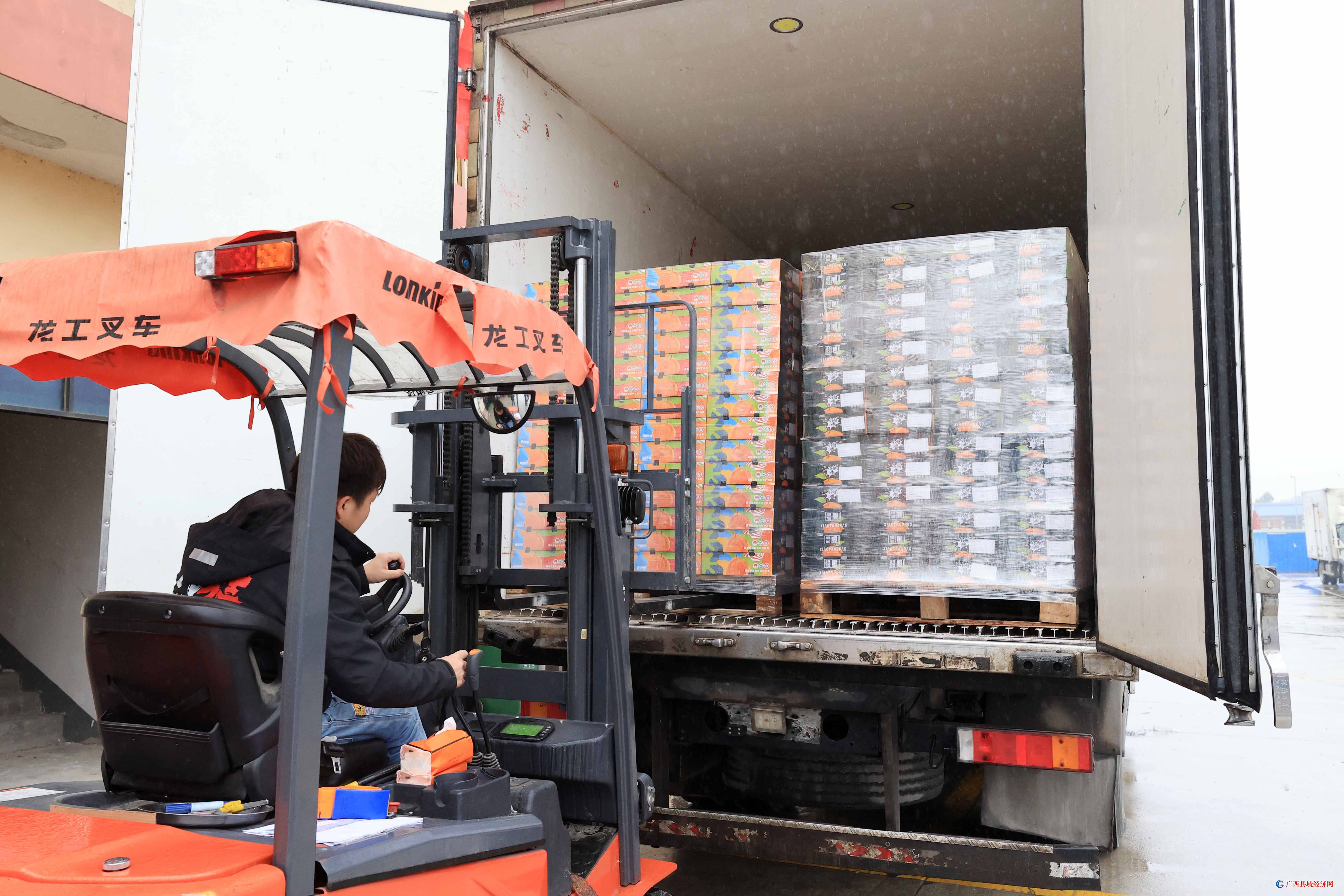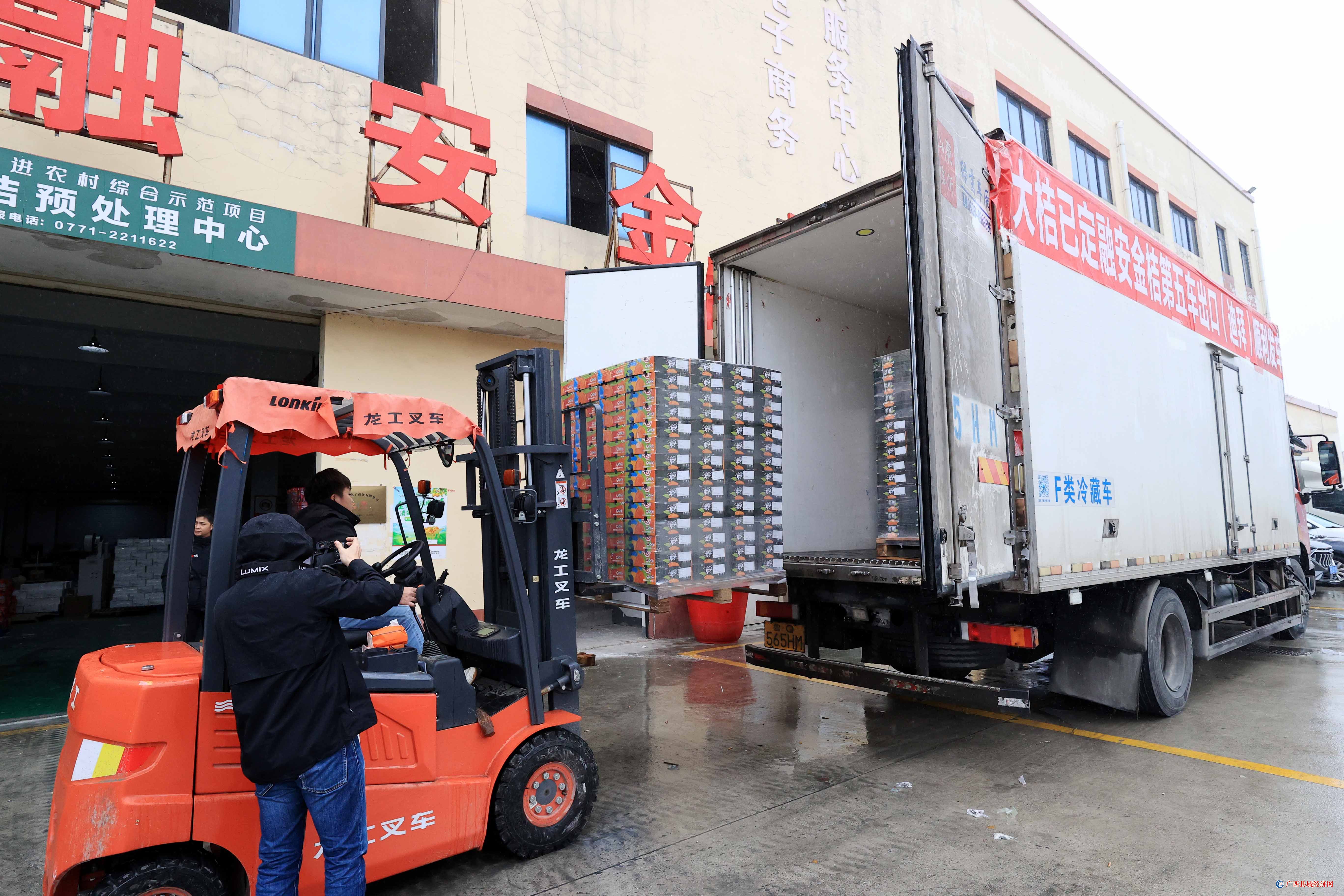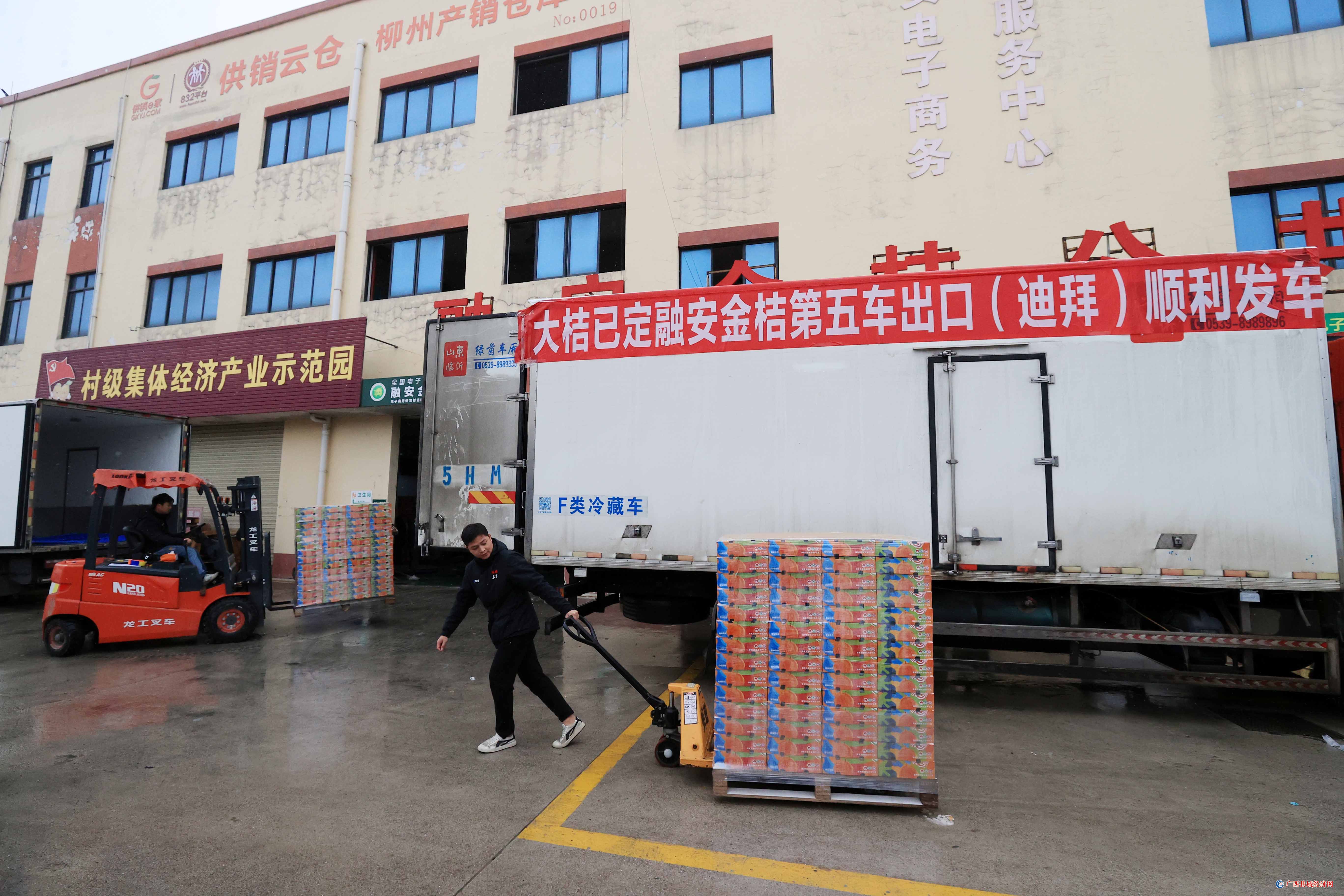 1月31日,在广西柳州市融安县蚂蚁农业有限公司金桔生产车间门口,工作人员将4000件融安金桔装进冷藏保鲜车,准备运往海关出口迪拜。