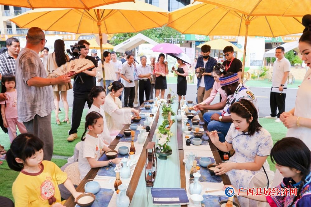 当天,象州茶肆在象州体育馆网红直播街正式开放,这座融合传统茶文化与现代潮流的“宝藏小城”,瞬间成为五一假期的绝佳去处。活动内容丰富多彩,游客们沉浸于茶香、乐声与古风游戏的多元体验中,共同见证了一场文化盛宴。《梦华录》同款宋代点茶体验更是人气爆表,游客们亲手执壶击拂,体验“茶百戏”的雅趣。不少家长带着孩子参与茶学礼仪体验,在茶艺师的指导下感悟“和敬清寂”的茶道精神,修身养性,陶冶情操。