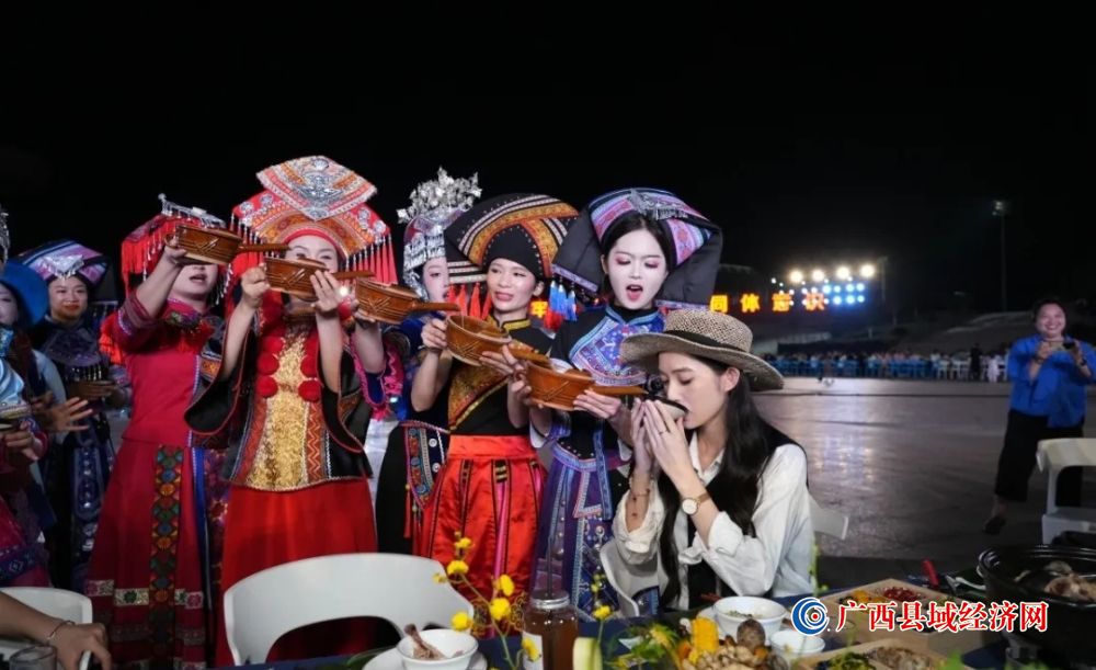 在5月3日晚的“民族团结宴”现场,长桌围成巨大同心圆,宾客在品尝壮族五色糯米饭、葛根筒骨汤、黄豆鱼仔、菜包等极具民族特色的美食的同时,还能体验高山流水互动仪式之雅,听民族歌舞与dj混搭之潮,并参与到享全民泼水狂欢之乐中。这场盛宴,不仅是舌尖上的享受,更是一场文化交融的生动实践,让人直呼过瘾。
