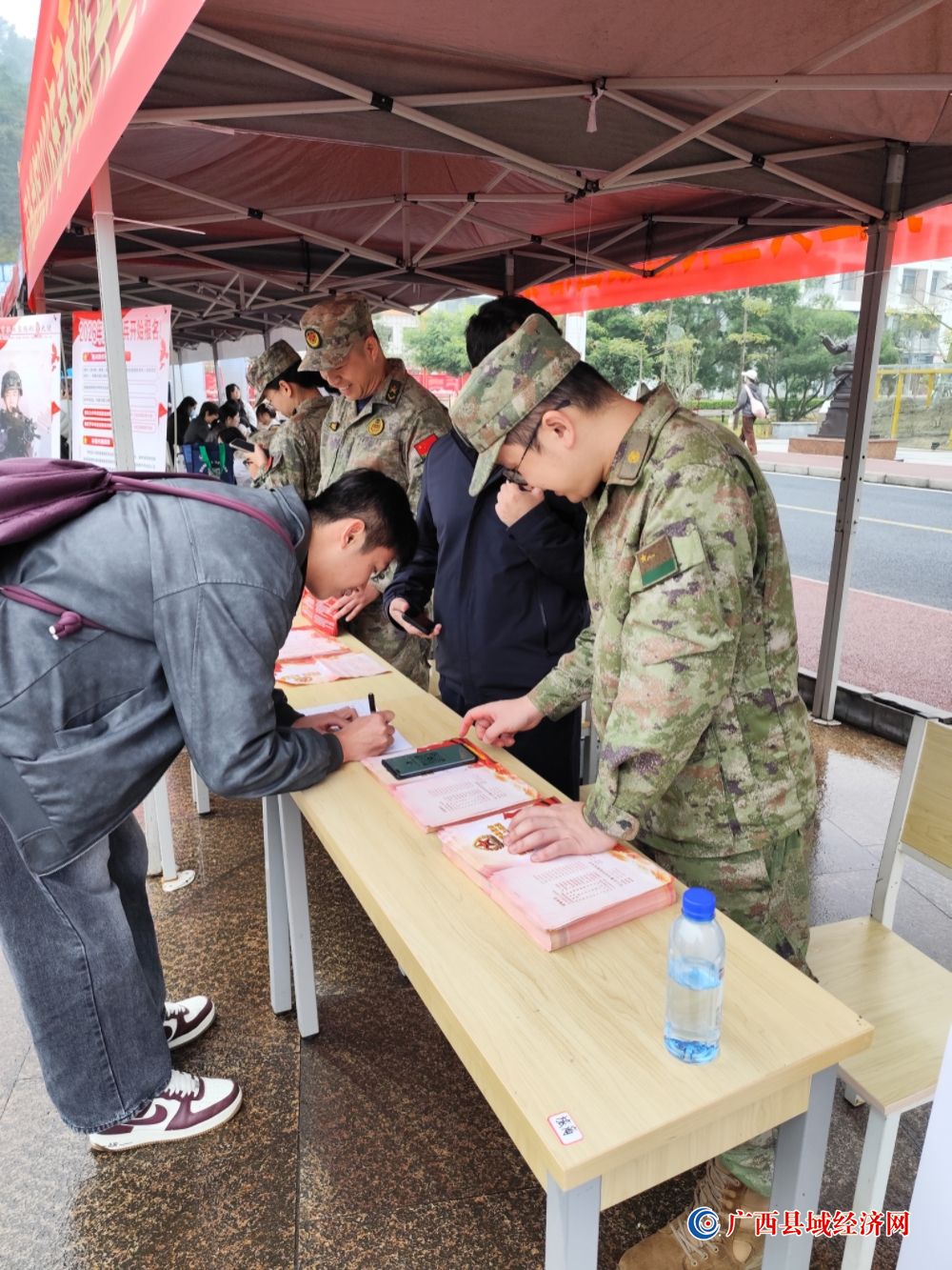 冬日的百色学院校园,寒意挡不住青春的热忱。12月12日,2026届毕业生冬季就业双选会现场人头攒动,右江区征兵办的征兵政策咨询专区前更是排起了长队——一场精心策划的2026年春季征兵主题宣传动员活动正在这里火热开展。当天,现场共有600余名学生驻足咨询、深入交流,青春的热血与国防的赤诚在此交融碰撞。
