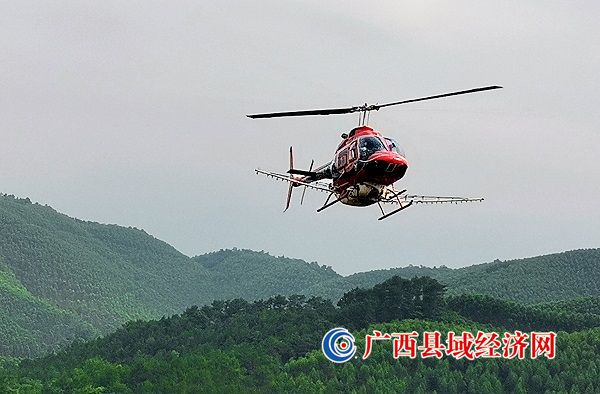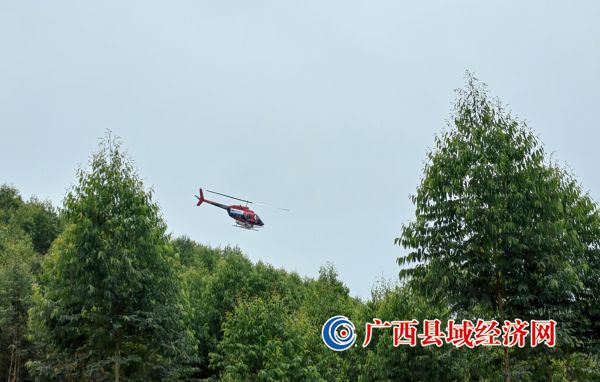 在防治作业现场,工作人员正在将调配好的药剂装到飞机药箱,随着一声轰鸣,这架满载400公斤药剂的直升机腾空而起,对事先定位导航的山林实施药剂喷洒作业。派阳山林场森防站站长张明慧说:“今年我们聘请广西丰茂林业科技有限公司共同开展防治,首次引进植保直升机防治方法,省时高效,有效控制桉树叶斑病大面积发生和蔓延,促进林木健康生长。”广西丰茂林业科技有限公司总经理邱瑞霞说:“此次飞防使用药剂为杀虫剂、杀菌剂和叶面肥,均为高效、低毒、低残留安全制剂,对环境影响小,人畜无害。”