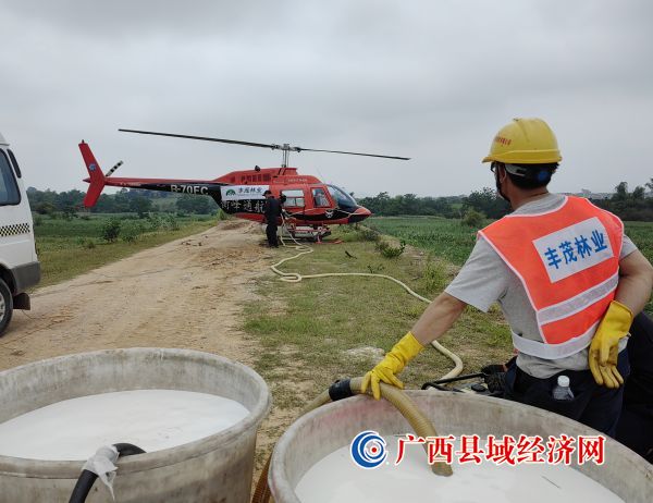 据了解,本次飞防所采用植保直升机型号为bell206,总计飞防26架次,喷洒药剂1.3吨。飞防地点为该场北江营林部、那楠营林部及大王山分场连片桉树纯林,涉及宁明县北江、东安、板棍、那楠4个乡镇林地。