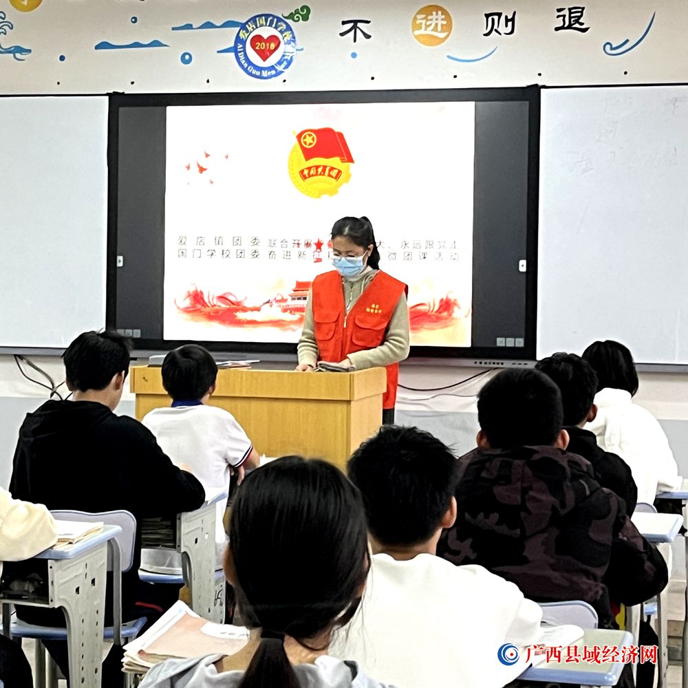 图三、青年团员、宁明县爱店镇堪爱村抵边村预防青少年违法犯罪专职干事闭晓波向爱店国门学校学生宣讲党的二十大精神。
