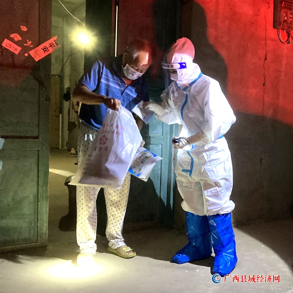 图一、青年团员、宁明县爱店镇堪爱村抵边村预防青少年违法犯罪专职干事闭晓波(右一)深夜为居家隔离群众配送医疗药物。