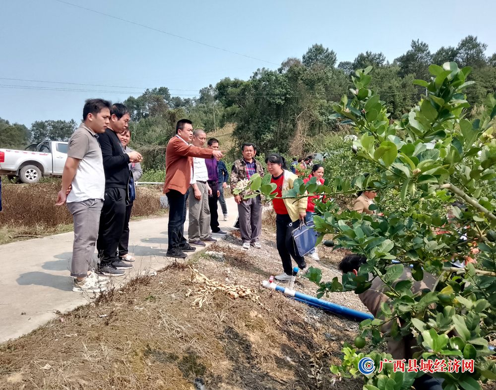 图六、2023年3月10日,黄圣文(左四)组织全乡人大代表到思陵村无籽香水柠檬产业基地调研。