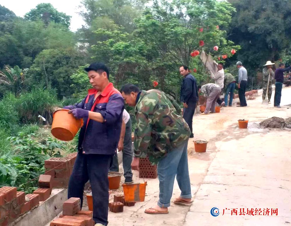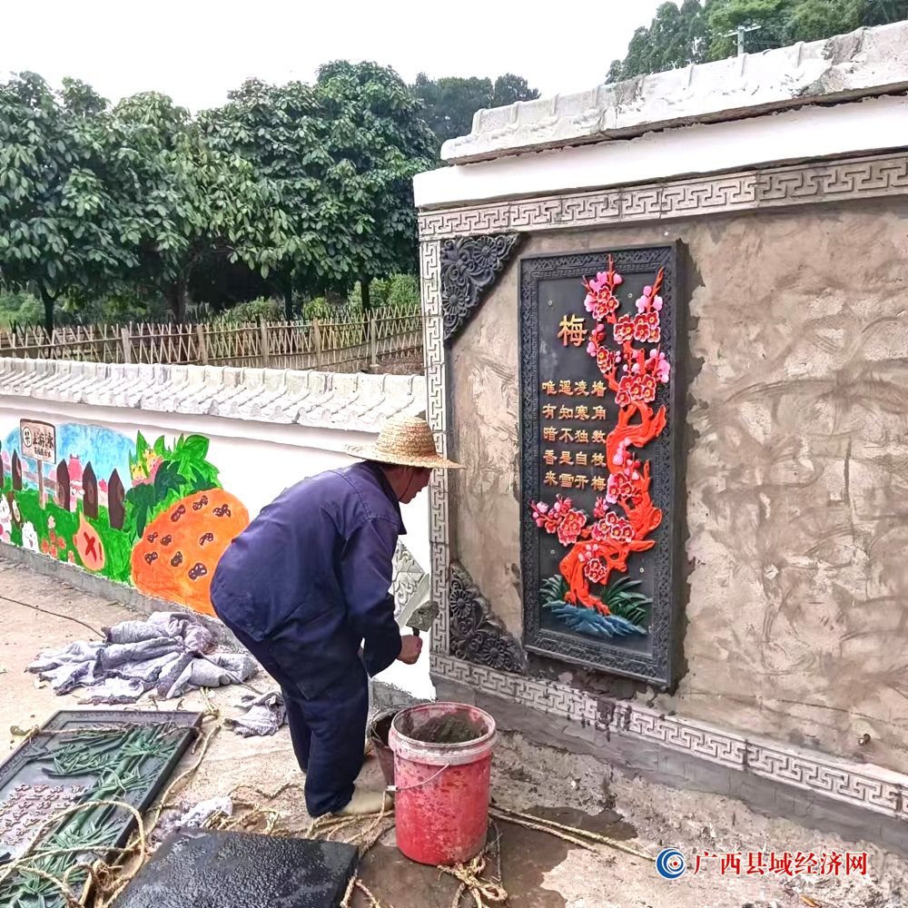 图三、邱上其正在认真砌制六丈屯文化宣传墙。(周贻刚 摄)