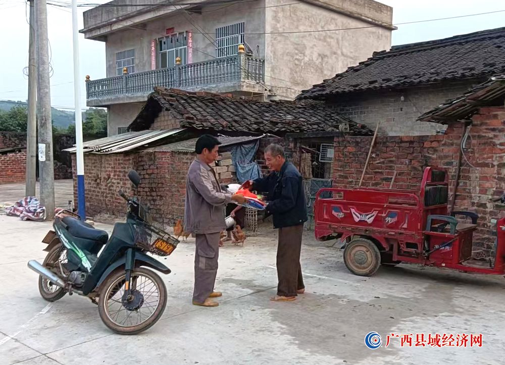图四、邱上其(左一)购买两套保洁服赠送给六丈屯保洁员。 (周贻刚 摄)