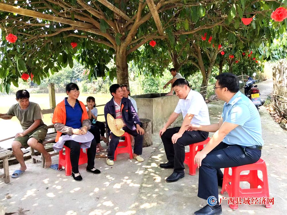 图一、宁明县人民政府县长孙金水(右二)深入东安乡六丈村六丈屯调研工作时与邱上其(前左三)交流意见。(周贻刚 摄)