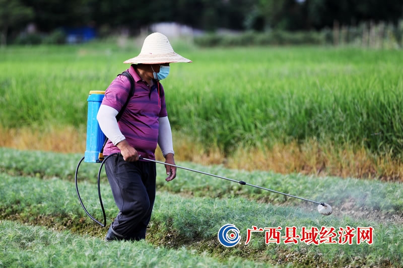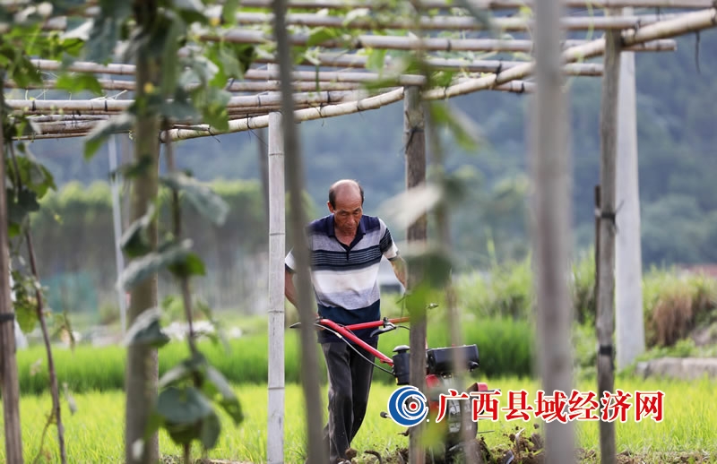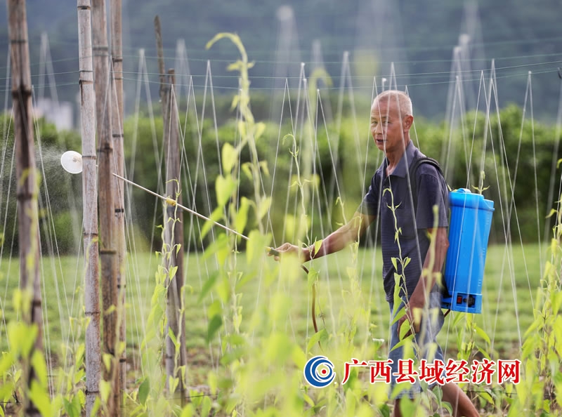 2021年6月21日,在广西柳州市融安县长安镇大巷村,一名农民在田间管护农作物。(韦荣军 摄)