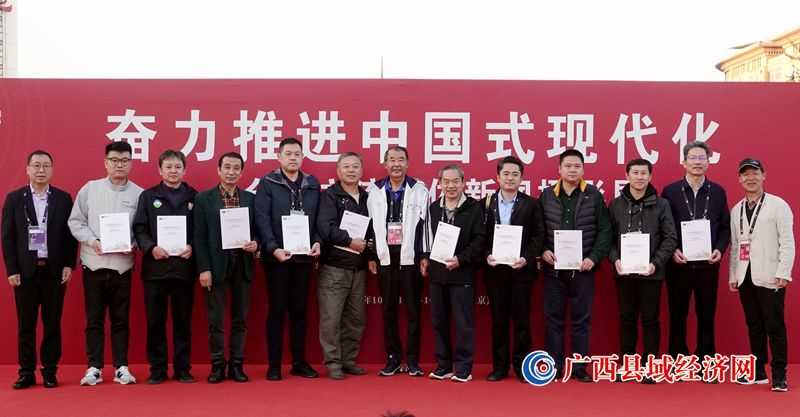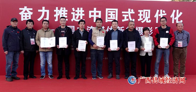 图为中国新闻摄影学会副会长赵建伟(右七)、中国新闻摄影学会副会长周朝荣(右一)、中国行业报协会副会长孙福会(左一)向参展单位代表和作者颁发参展证书。