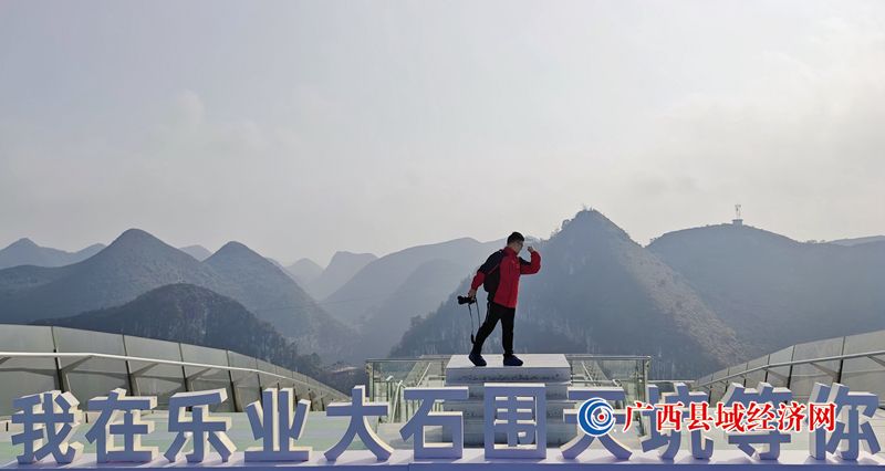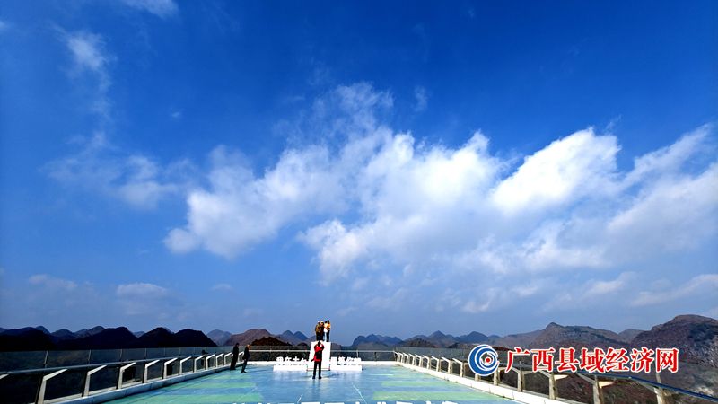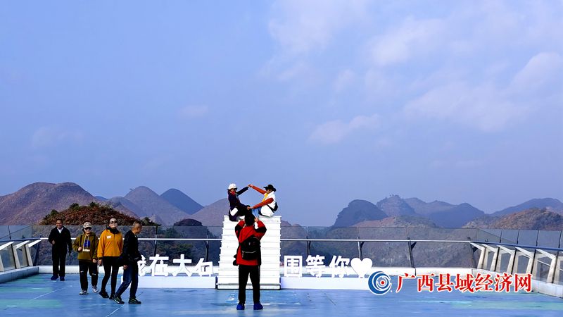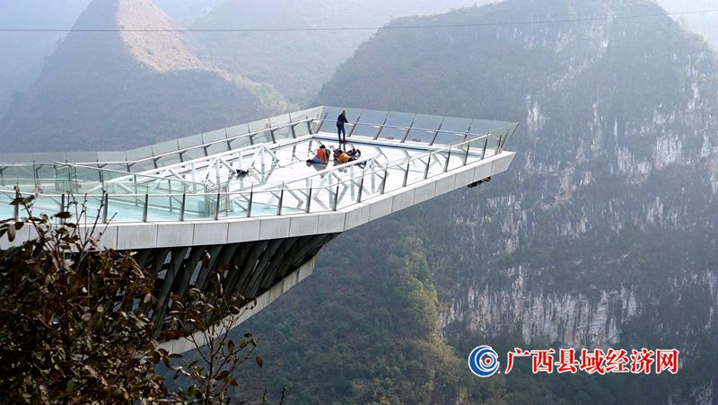 游客在广西乐业县大石围天坑的玻璃栈道上打卡拍照。
