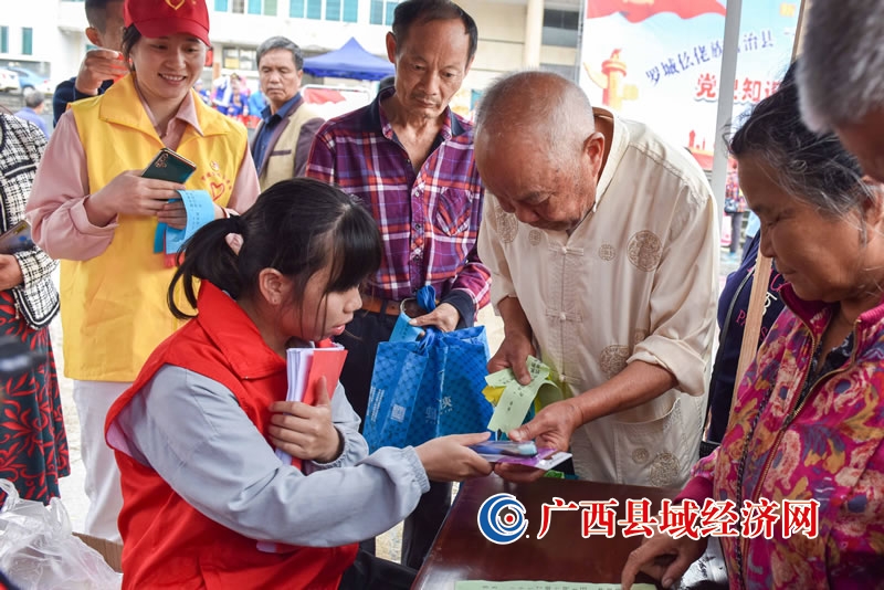 5月18日,在罗城仫佬族自治县民族文化广场,“学党史 感党恩 跟党走”党史知识有奖竞答兑奖现场。
