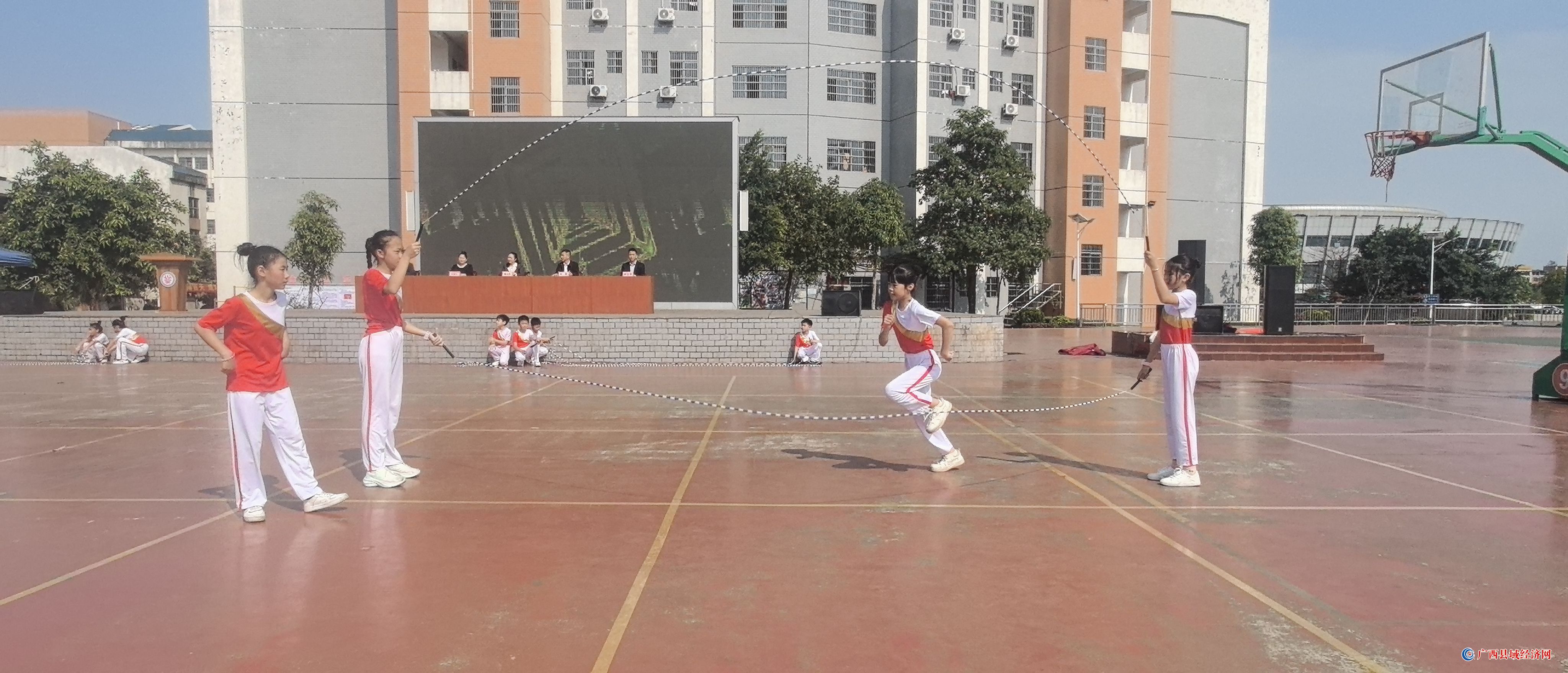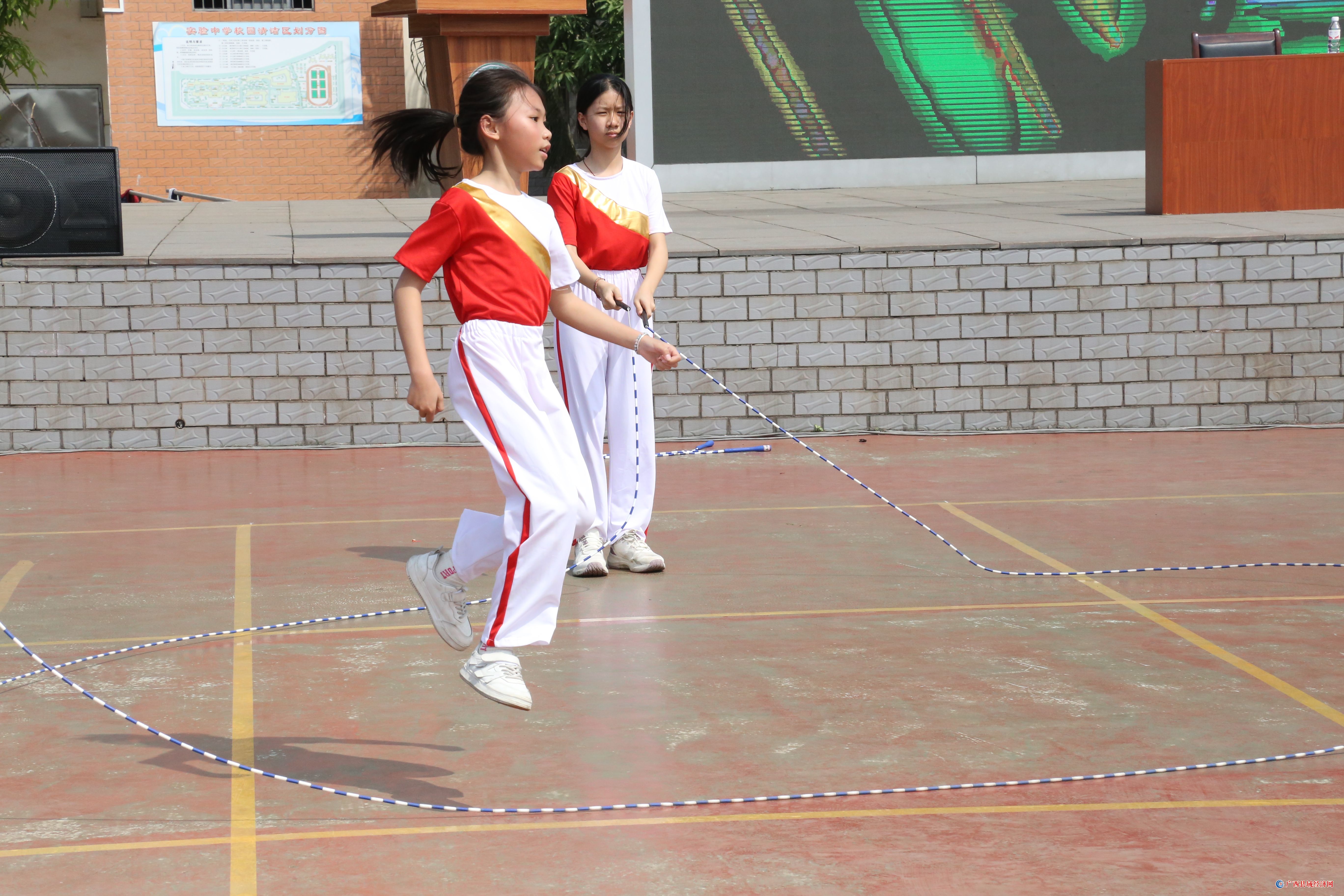 当天,田阳区实验中学和第一小学跳绳队分别带来啦啦操和跳绳表演。