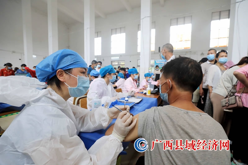 6月3日,在广西柳州市融安县大型临时接种点,医护人员在为市民接种新冠肺炎疫苗。(谭凯兴 摄)