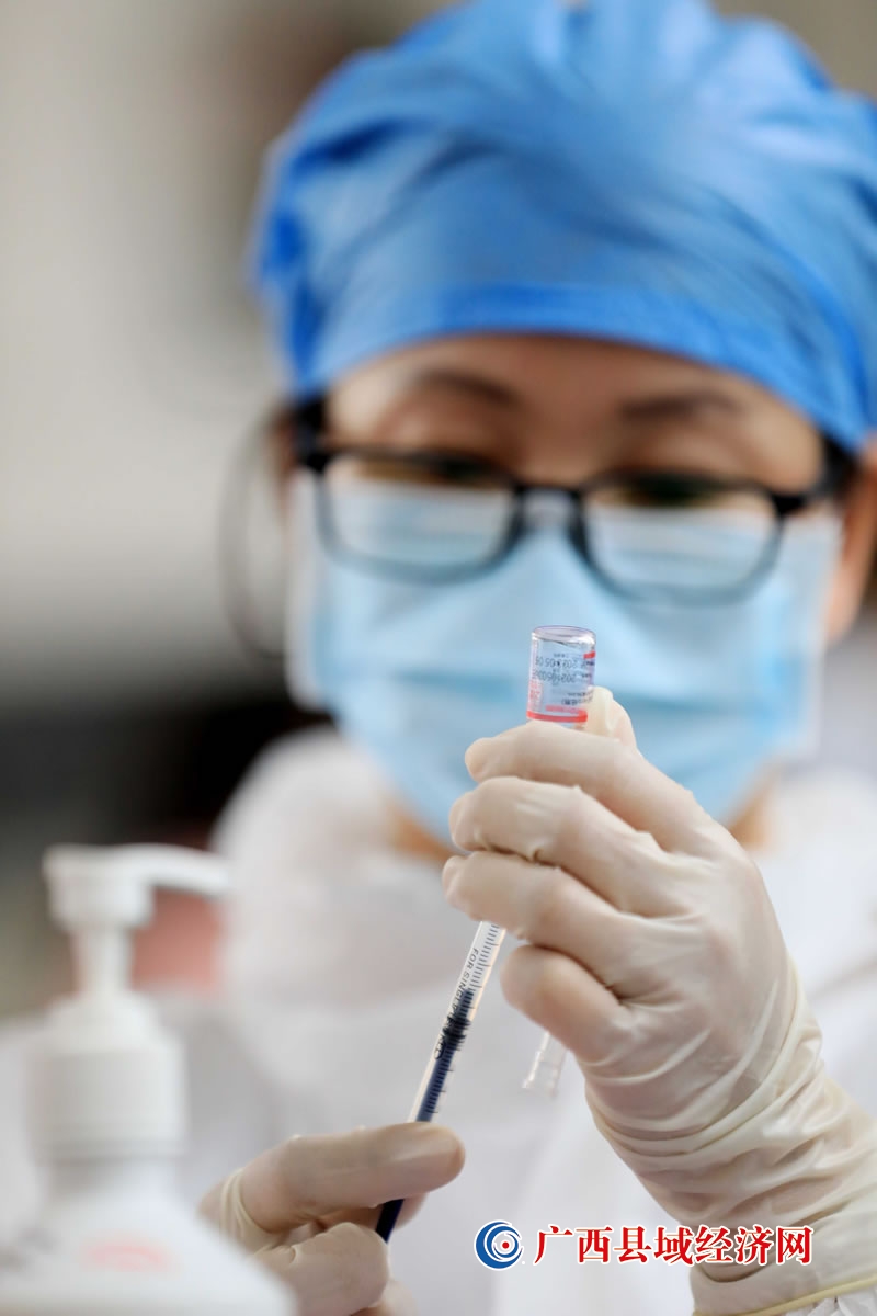 6月3日,在广西柳州市融安县大型临时接种点,医护人员在准备疫苗,为市民免费接种。(谭凯兴 摄)
