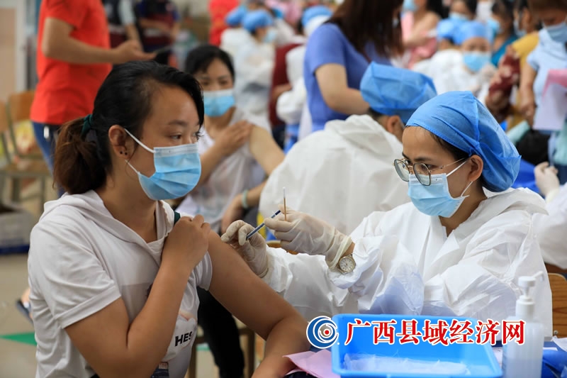 6月3日,在广西柳州市融安县大型临时接种点,医护人员在为市民接种新冠肺炎疫苗。连日来,广西柳州市融安县通过设立新冠肺炎疫苗大型集中接种点,动员和发动市民尽快接种新冠肺炎疫苗,为市民发放新冠肺炎预防知识,提高全民预防意识,还通过手机客户端、电视、网络等宣传平台,进行广泛宣传,让市民掌握预防知识。截至6月3日,该县已经接种新冠肺炎疫苗91306人份。