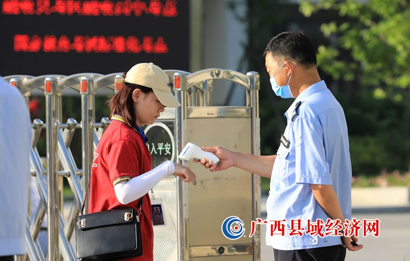 6月7日,在广西柳州市融安县高中考点,工作人员为考生检测体温。(谭凯兴 摄)