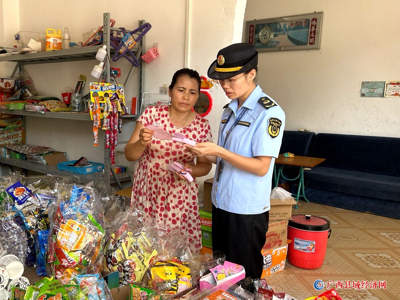 图为执法人员查看校园周边食品经营者进货情况。