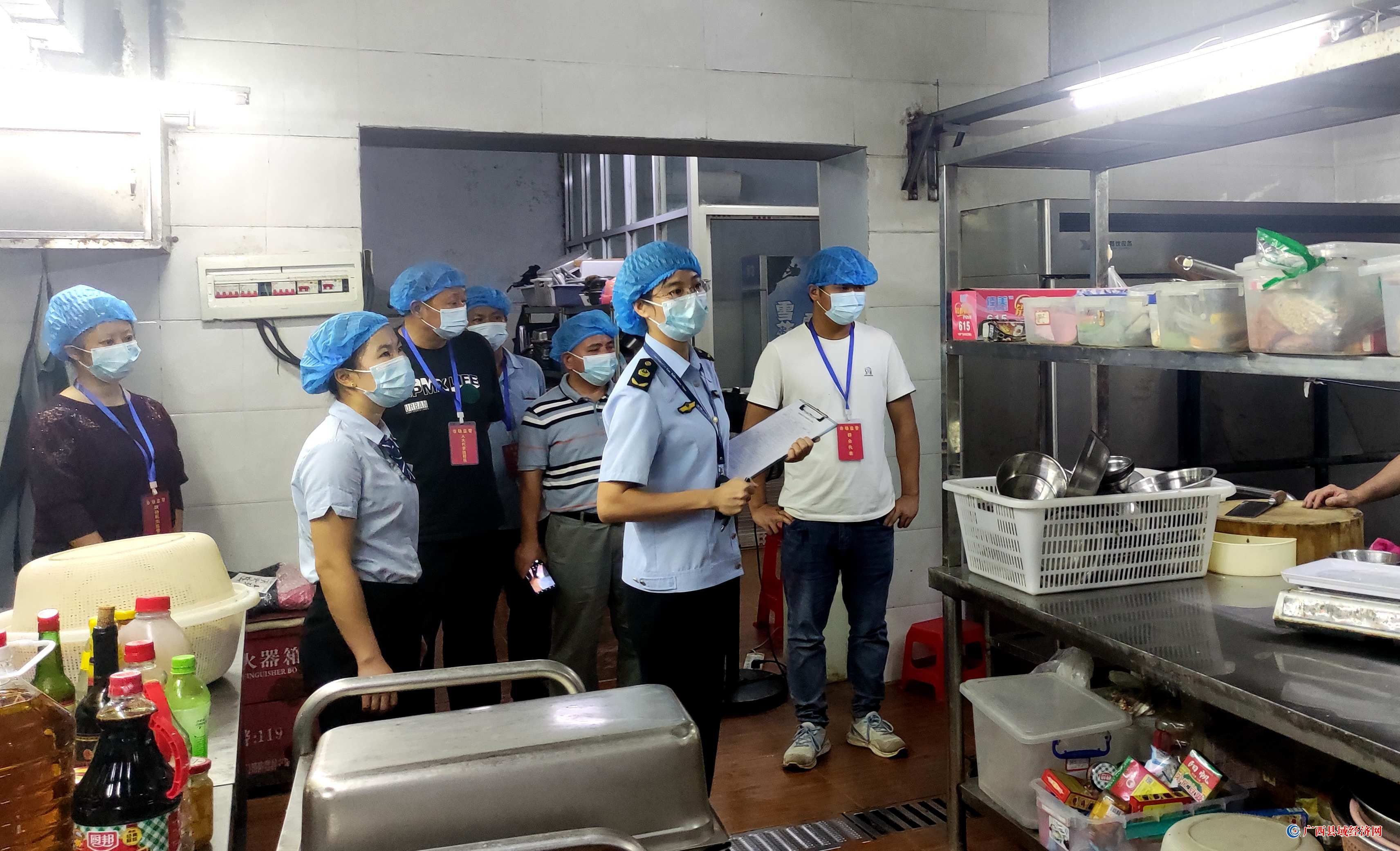 图为检查组检查餐厅厨房操作间设备设施等情况。