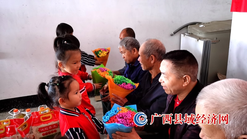 10月24日,广西河池市金城江区五圩镇中心幼儿园的孩子们在为敬老院的老人献花。