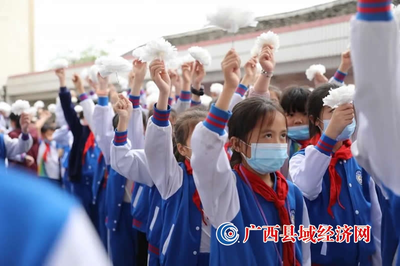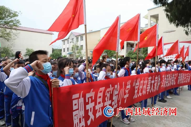 4月2日,融安县实验小学到长安镇大巷村开展“党史故事大家讲·革命英烈永铭记”清明祭扫活动,少先队员缅怀先烈,并宣誓。(罗洁芳 摄)