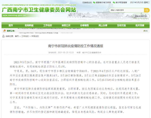 2021年5月24日,南宁市根据广州市荔湾区疾病预防控制中心的协查函,在对协查重点人员进行排查及核酸检测中,发现核酸检测显示阳性人员1例。