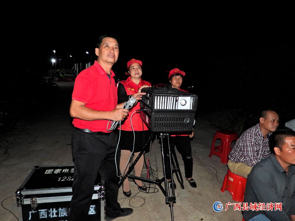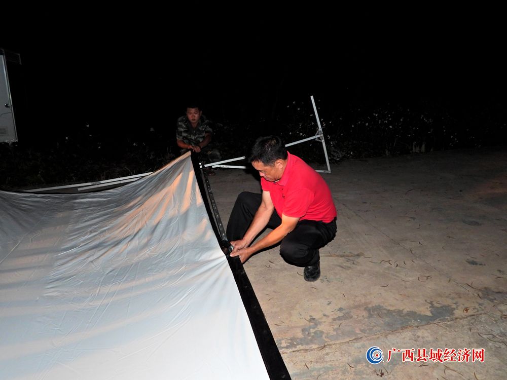 图三、10月23日,广西宁明县峙浪边境爱民电影队队长韦柯(左一)在桐棉镇那马村1270界碑疫情防控卡点调试电影放映设备。 (周贻刚 摄)