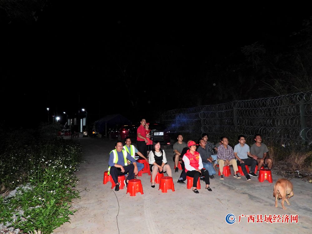 图六、10月23日,广西宁明县桐棉镇那马村1270界碑疫情防控卡点值守人员和边境群众正在观看爱国主义影片《西地突围》。 (周贻刚 摄)