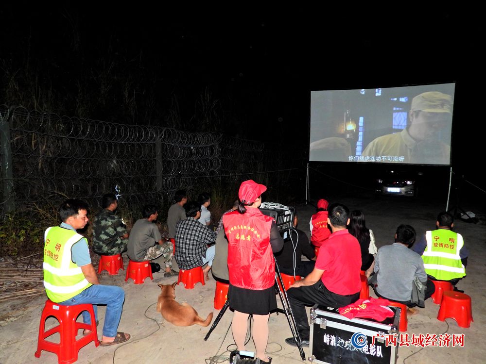 图四、10月23日,广西宁明县峙浪边境爱民电影队在桐棉镇那马村1270界碑疫情防控卡点为值守人员和边境群众放映爱国主义影片《西地突围》。