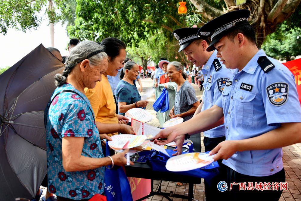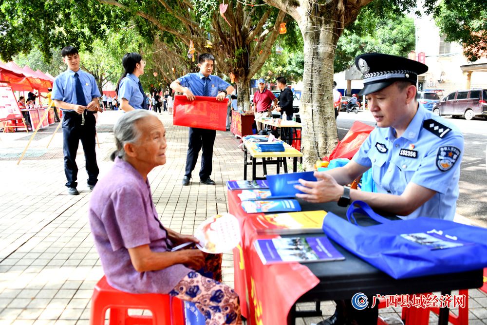 图四、6月16日,广西宁明县人民法院干警在县城江滨北路2023年“安全生产月”宣传活动中向群众进行“反诈骗”宣传及讲解安全生产相关知识。 (周贻刚 摄)