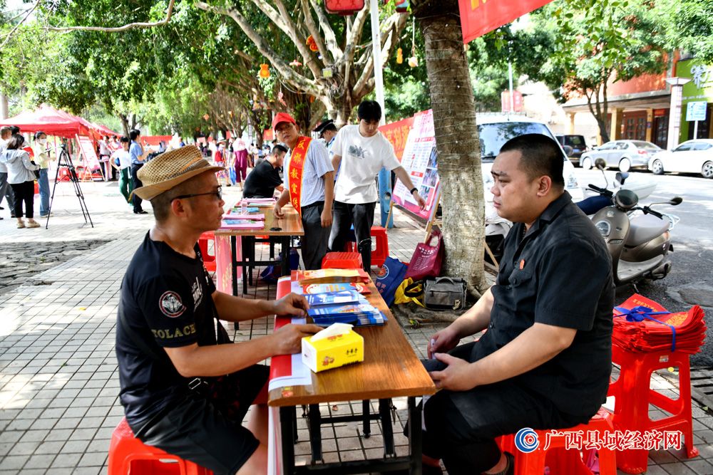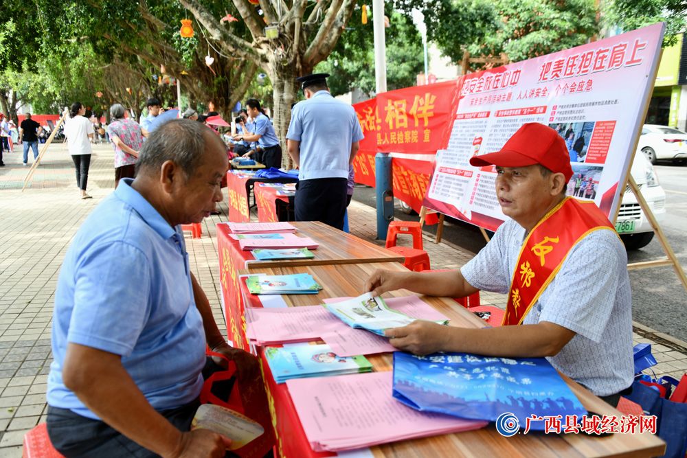 图二、6月16日,广西宁明县委政法委干部在县城江滨北路2023年“安全生产月”宣传活动中向群众进行“反邪教”宣传及讲解安全生产相关知识。 (周贻刚 摄)
