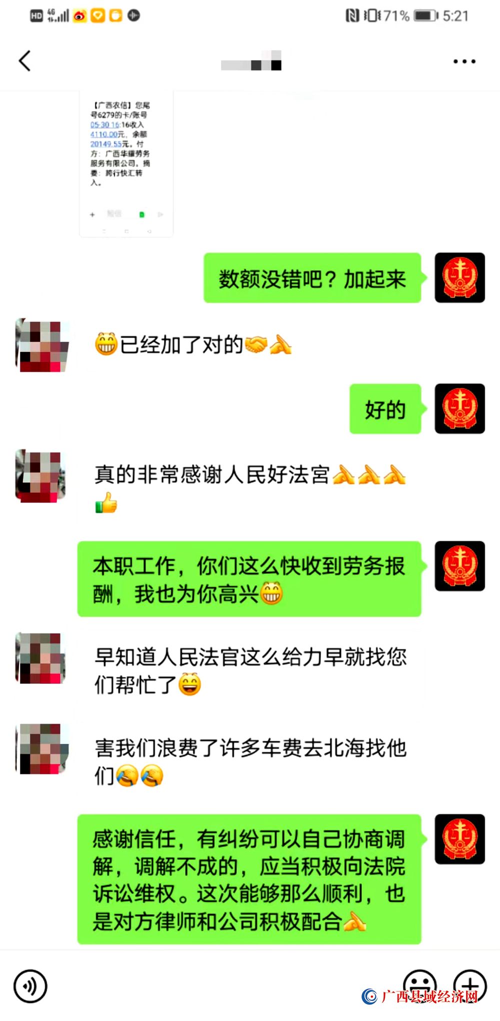 宁明县人民法院立案庭庭长蒙栖梧接到案件后,逐一电话联系当事人,并使用工作微信添加农民工微信进行沟通联系,同时做好安抚被欠薪农民工情绪工作。在特邀调解员凌春艳先前调解的基础上,被告公司很快主动表明了调解意向,承诺尽快向农民工支付拖欠工资。蒙栖梧庭长通过微信组织双方确认拖欠数额后,用工公司于5月31日将拖欠赵某与韦阿姐等人的工资共计5万余元通过银行转账方式全部支付到位。赵某与韦阿姐等人收到汇款短信通知后,当天提出撤诉申请,案件在立案后18天内得到圆满解决。