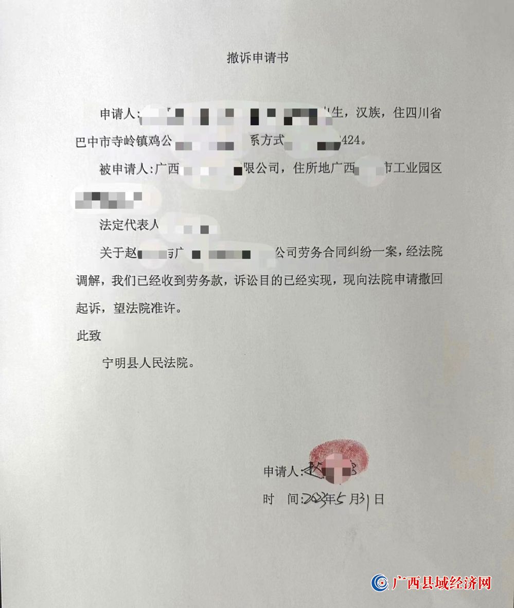 图三、赵某与韦阿姐等人向宁明县人民法院提交的撤诉申请书。 (曾慧 摄)