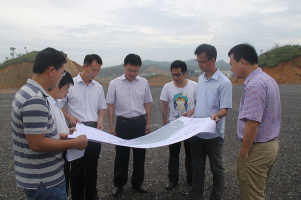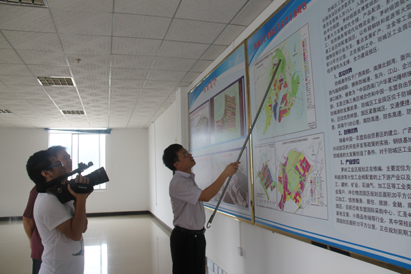 防城区招商促进局局长何伟江(右一)带采访组考察防城区工业园区