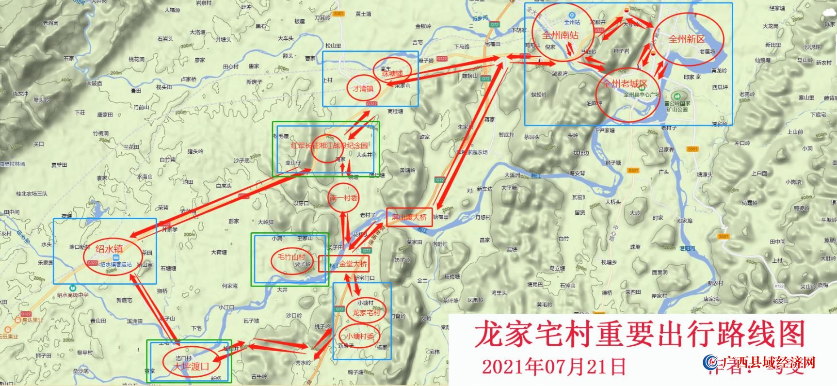 3)、目的地:全州县城。从龙家宅村庄(自行开车)出发-经过小塘村委-走和睦拉方向-经过大坪渡口--经过322国道绍水镇--全州县城