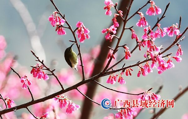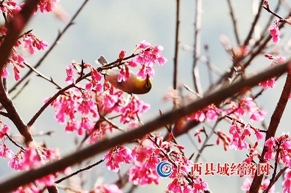 2023年2月15日,在广西柳州市融安县东起乡崖脚村铜板屯,一只鸟儿在花丛中栖息。(韦荣军 摄)