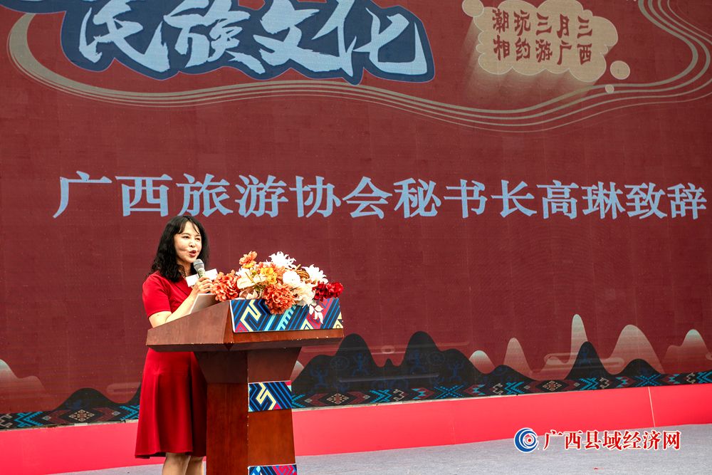 广西旅游协会秘书长高琳在致辞中说:“潮玩三月三·相约游广西——首届广西民族文化旅游推广季活动”,是“壮族三月三·八桂嘉年华”活动的进一步推广和延伸,旨在贯彻落实《广西“十四五”文化和旅游发展规划》中提出的打造“壮族三月三”“刘三姐文化”等民族文化大品牌的战略任务,借势广西“壮族三月三·八桂嘉年华”活动品牌影响力,深挖广西民族特色的品牌活动。潮玩三月三·相约游广西将联动各地级市,各县(市、区)以及行业协会和文旅企业结合广西全年民族节庆活动,共同开发和打造民族村寨游览、民族风情体验、民族文化演艺、民族节庆节事、民族美食购物等民族文化旅游产品和民族文化旅游节庆品牌,努力推向市场,助推广西民族文化和旅游大融合发展,带动乡村旅游经济振兴,助推广西文化旅游高质量发展。